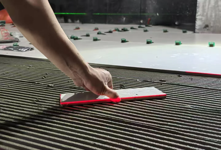 ⑥ 地砖「齿形刮板」+「瓷砖胶」:空鼓率≤3%